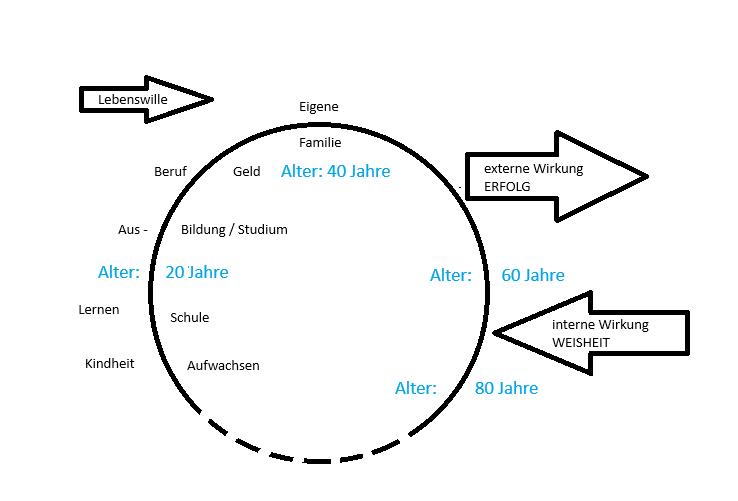 Ich werde gleich ein Modell vorstellen, in dem ich meine ganz persönliche Sicht auf unser (mein) Leben, dessen Verlauf und dessen Sinn – gerade im Hinblick auf das „Altern“ – vorstellen werde. Ich beabsichtige dabei nicht, dieses Modell als das „einzig Richtige“ zu bezeichnen; vielmehr ist es mein Versuch, die unterschiedlichen Phasen unseres Lebens zu beleuchten, wobei mein Schwerpunkt auf dem Bereich „Alter“ liegt.